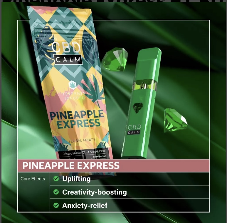 Terpenes are naturally occurring compounds found in the marijuana plant, responsible for giving each strain its distinct flavour and aroma. We’ve infused this CBD Calm disposable vape with the terpenes of the Pineapple Express strain!